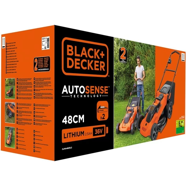 Der Autosense Akku-Rasenmäher CLMA4825L2 von BLACK+DECKER erkennt automatisch die Motorlast und arbeitet im optimalen Modus. Die Motorleistung erhöht sich wenn erforderlich, und bei geringer Motorlast verlängert sich die Akku-Laufzeit. 48cm Schnittbreite und 2 ausdauernde Lithium-Ionen Akkus machen ihn zu einem idealen Mäher für Rasenflächen bis zu 600m², ohne Abgase, lästige Steckerverbindungen oder Verlängerungskabel. Der einfach zu entleerende Grasfangsack fasst ein Volumen von 50 Litern. Dank 3-in-1 Funktion ist der CLMA4820L2 äußerst flexibel einsetzbar. Der Fangkorbmodus sorgt für minimale Nacharbeit, die Seitenentleerung für einfaches Zusammenrechen und der Mulchmodus dient zur Anreicherung des Bodens mit Nährstoffen. Je nach Wunsch kann die Schnitthöhe in 7 Stufen angepasst werden, zentral von 38-100mm, mit nur einem Handgriff. Der integrierte Tragegriff macht den Transport des CLMA4825L2 zum Kinderspiel und die umklappbaren Griffe machen ihn kompakt und platzsparend bei der Aufbewahrung. Die 36V Akkus sind übrigens mit allen BLACK+DECKER 36V Akku-Garten- und Haushaltsgeräten verwendbar.Art.-Nr.: 1857477