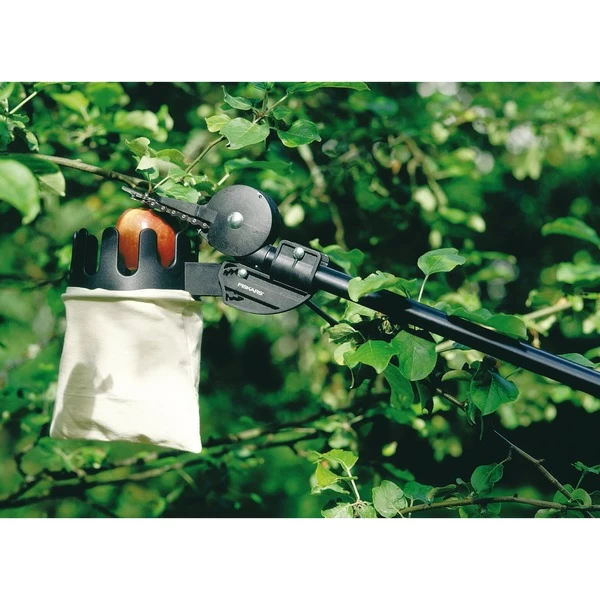 Der Obstpflücker 1001562 von Fiskars lässt sich ganz einfach an eine der drei Modelle der Fiskars Schneidgiraffen anbringen. Er passt sowohl zu der Teleskop-Schneidgiraffe als auch zu der langen sowie zu der „normalen“ Schneidgiraffe gleichermaßen gut. Praktisch dabei ist, dass man für die Anbringung keinerlei Werkzeug benötigt. Die Befestigung erfolgt über einen speziellen Verschluss am Obstpflücker selbst. Er besteht aus verschiedenen Materialien – zum einen aus glasfaserverstärktem Kunststoff, zum anderen aus gehärtetem Aluminium. Beide Materialien sorgen für die Langlebigkeit der Halterung sowie für ihre Stabilität. Das Auffangsäckchen für das Obst ist hergestellt aus weißer Baumwolle. Insgesamt wiegt der Obstpflücker gerade mal 219 Gramm, bei einer Gesamtlänge von 29 Zentimetern. Der Durchmesser der Halterung für das Auffangsäckchen beträgt 16 Zentimeter. Die stabilen Teile des Obstpflückers sind schwarz und passen farblich zu den kombinierbaren Modellen der Fiskars Schneidgiraffen. Mit dem Obstpflücker kann man sich endlich über frisches Obst ohne Druckstellen, die vom Herunterfallen auf den Boden kommen, freuen. Art.-Nr.: 1412139