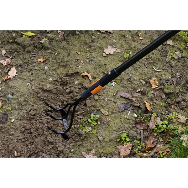 Der QuikFit Krümmerjäter von Fiskars kann gleich zwei Geräte ersetzen, denn er kann für mehrere Aufgaben verwendet werden. Zum einen können seine Zinken als Krümmer zum Lockern und Lüften von leichten bis mittelschweren Böden benutzt werden. Zum anderen befindet sich auf seiner Rückseite ein Jäter. Mit diesem Gerät kann der Boden zum Bepflanzen vorbereitet werden. Darüber hinaus kann das Werkzeug zur Beetpflege benutzt werden. Die Zinken aus gehärtetem Stahl sind besonders stabil und besitzen außerdem lanzenförmige Spitzen. Die breiteste Stelle des Geräts beträgt 12,5 Zentimeter. Insgesamt ist der Fiskars QuikFit Krümmerjäter 31 Zentimeter lang, sein Gewicht beträgt dabei 507 Gramm. Art.-Nr.: 1412558