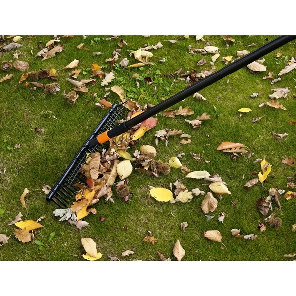 Beim QuikFit Rasenrechen von Fiskars handelt es sich um einen breiten Werkzeugkopf, der zum Säubern des Rasens benutzt werden kann. Der QuikFit Rasenrechen hat eine Breite von 57 Zentimetern. Er sammelt zuverlässig und unkompliziert alles, was nicht auf den Rasen gehört. Seine Zinken liegen so dicht beieinander, dass er Blätter und Rasenschnitt auf der Rasenfläche gründlich zusammenharkt. Der Rechen ist aus gehärtetem Karbonstahl gefertigt, was ihn besonders stabil und langlebig macht. Der Fiskars QuikFit Rasenrechen ist an jedem Stiel des QuikFit-Sortiments schnell und einfach montierbar. Art.-Nr.: 1412535