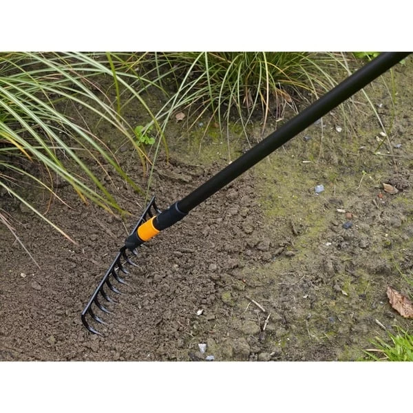 Gartenarbeit ist vielfältig und erfordert ein ebensolches Sortiment von Werkzeugen. Zu den Aufgaben bei der Gartenarbeit gehören zum Beispiel das Harken, Einebnen und Glätten von Beeten. Um diese Arbeit besonders gut ausführen zu können, eignet sich zum Beispiel der Fiskars QuikFit Rechen mit 14 Zinken. Die Zinken bestehen aus einem speziellen Material, aus gehärtetem und somit sehr stabilem Kohlenstoffstahl. Das Produkt hat eine Breite von 36 Zentimetern, was sehr praktisch ist, denn damit kann mit einem Mal eine größere Fläche bearbeitet werden. Die Gesamtlänge des QuikFit Rechens mit 14 Zinken von Fiskars misst 20,5 Zentimeter. Dabei wiegt das Werkzeug 428 Gramm und kann an jedem Stiel sowie am Handgriff des QuikFit-Sortiments montiert werden. Art.-Nr.: 1412546