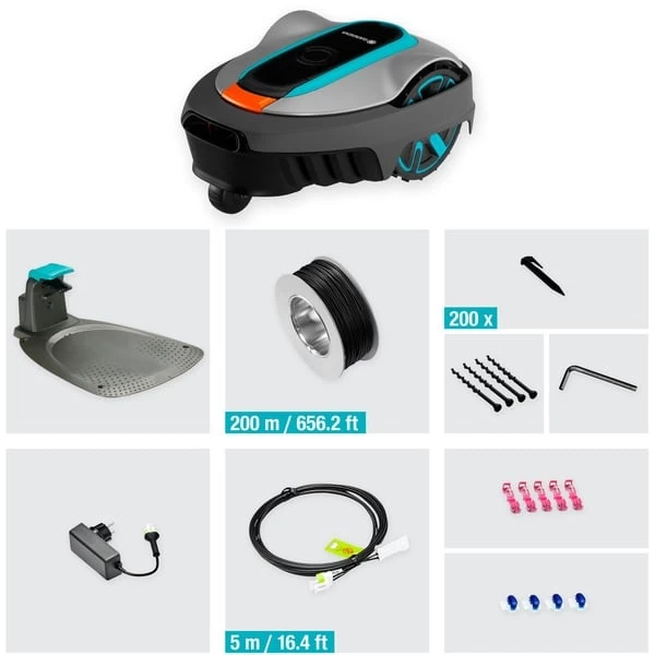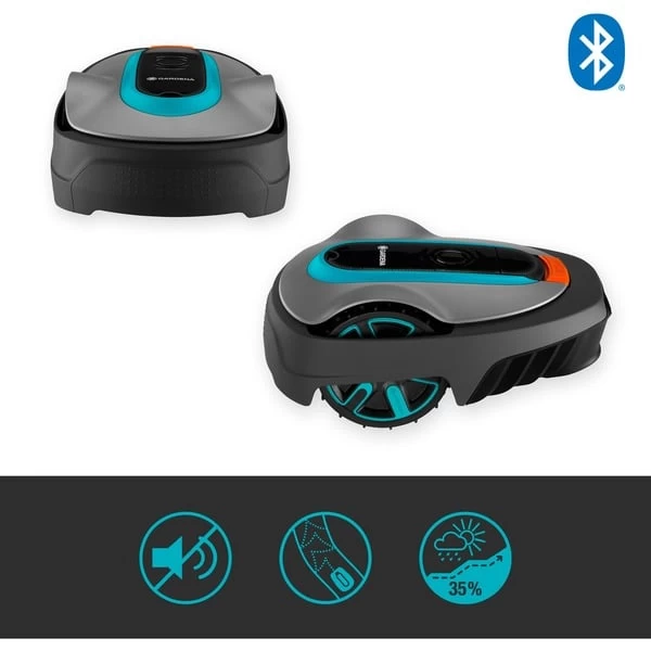 | Bedienung | Programmierung der Mähzeiten über Tastenfeld und Display oder GARDENA Bluetooth App mit Reichweite bis zu 10 Meter | ||