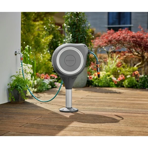 Kein Bücken, kein Kurbeln und keine schmutzigen Hände, das schätzen Gärtner an der GARDENA Terrassen-Schlauchbox RollUp M. Darin ist der Schlauch durch die integrierte Schlauchführung immer gleichmäßig aufgerollt und jederzeit schnell einsatzbereit. Die Terrassen-Schlauchbox RollUp M kann direkt auf der Terrasse platziert werden. Mittels Universalbefestigung kann sie am Boden auf Terrassendielen aus Holz oder auf Betonfundamenten angeschraubt werden. Die kompakte Box lässt sich um 360° schwenken und ist mit 20 Meter Schlauch ausgerüstet. Mit den kurzen Arretierstopps kann der Schlauch auf die gewünschte Länge ausgezogen werden. Dank RollControl genügt nach Gebrauch ein kurzer Zug am Schlauch und er wird mit gleichmäßiger Geschwindigkeit und sicher automatisch wieder eingerollt. Die Terrassen-Schlauchbox RollUp M ist frostsicher, UV-beständig und kann das ganze Jahr über draußen an ihrem Platz bleiben.Art.-Nr.: 100025254